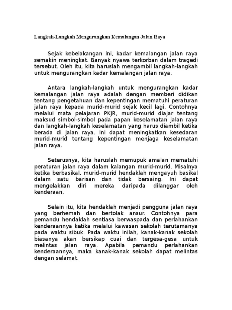 Yang dihormati tuan pengerusi majlis, yang berbahagia tuan. Langkah langkah mengurangkan kemalangan jalan raya syarahan tentang langkah langkah . Negara kita mempunyai angka kematian akibat kemalangan jalan raya yang tinggi. 17 januari 2013 at 111 pm cikgu terima kasih. Punca punca dan cara mengatasi kemalangan jalan raya. Sye amat2 memerlukan karangan itu balas.
